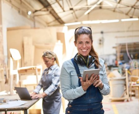 Lächelnde Handwerker Frau in der Tischlerei Werkstatt mit Tablet Computer
